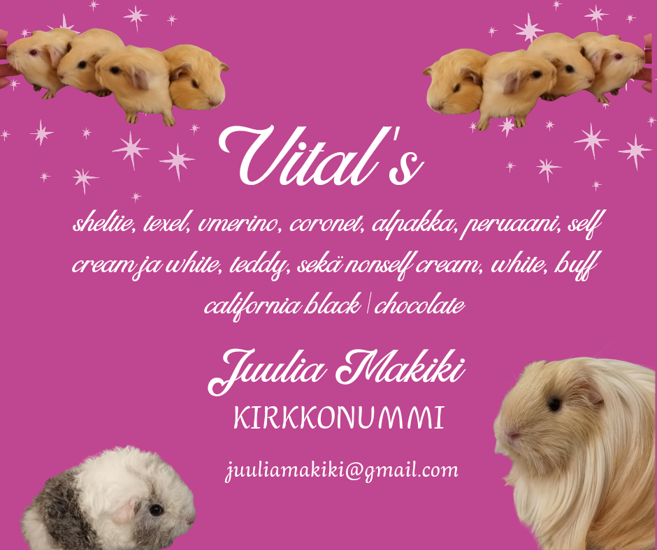 Itselläni on yli 30v. kokemus marsuista niin ammatillisesti, kuin harrastusmielessäkin. Olen mm. pieneläinhoitaja ja Suomen marsuyhdistyksen hyväksymä kasvattaja ja lemmikkimarsutuomari. Kasvatan nimellä Vital’s.